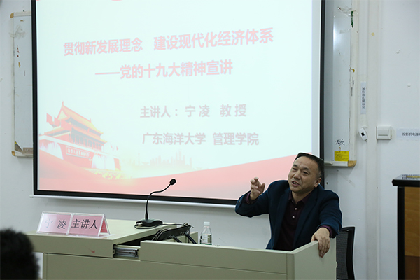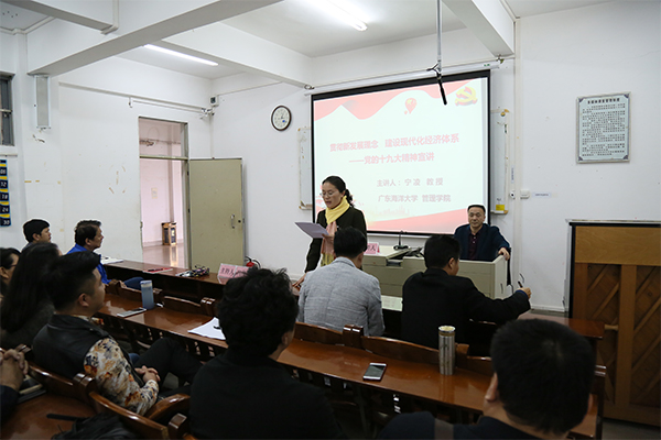 12月14日下午,朱古力av 在美术楼302室举行学习贯彻党的十九大精神专题辅导报告会,管理学院院长宁凌教授作了题为《贯彻新发展理念,建设现代化经济体系》的专题报告。会议由学院党委书记冯红爱主持,学院教职工和学生干部共130余人参加。