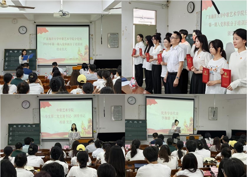 分党校2025第一期入党积极分子培训班结业仪式在艺海楼A302举行,学院党委副书记翟周,学生第二党支部书记、团委书记程倩,培训班班主任谢维杨,全体辅导员老师以及本期入党积极分子62名成员参加了结业仪式。