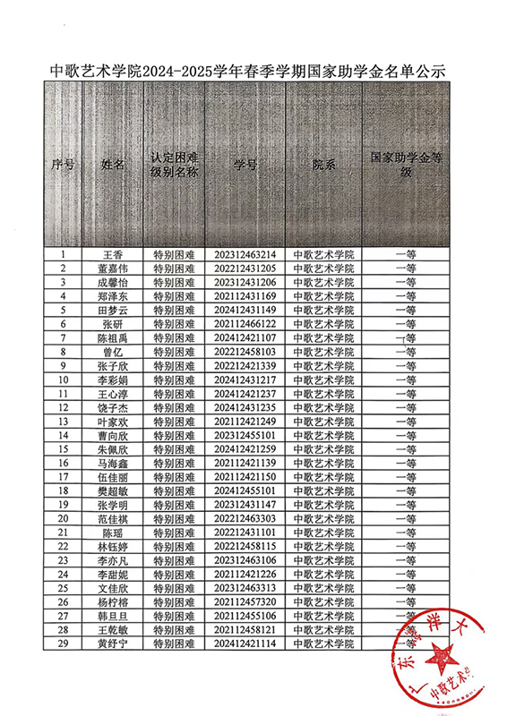 关于2024-2025学年春季学期国家助学金名单公示