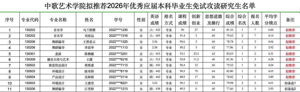 推荐优秀应届本科毕业生免试攻读研究生工作管理办法实施细则》,学院组织了2026年优秀应届毕业生免试攻读研究生遴选推荐工作。经学生报名、资格审查、综合评定和学院推免生遴选工作小组审查通过,乌兰图雅等9名学生为拟推荐对象,王惠莹等2名学生为拟备选对象,现予以公示。