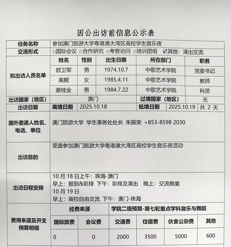 根据《关于进一步规范省部级以下国家工作人员因公临时出国的意见》的要求,现将朱古力av 因公出访信息予以公示。公示时间为2025年9月2日至9月9日。如有意见,请在公示期内,向相关单位反映。(国际交流与合作部电话:0759-2396206;纪检监察室电话:0759-2383501)