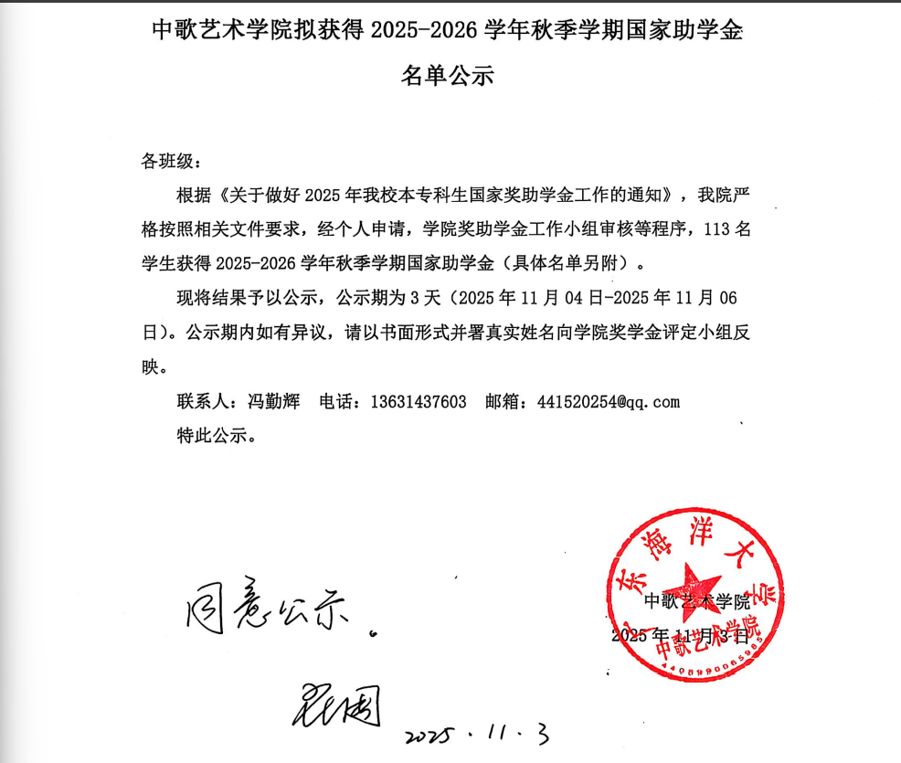 朱古力av 拟获得2025-2026学年秋季学期国家助学金名单公示