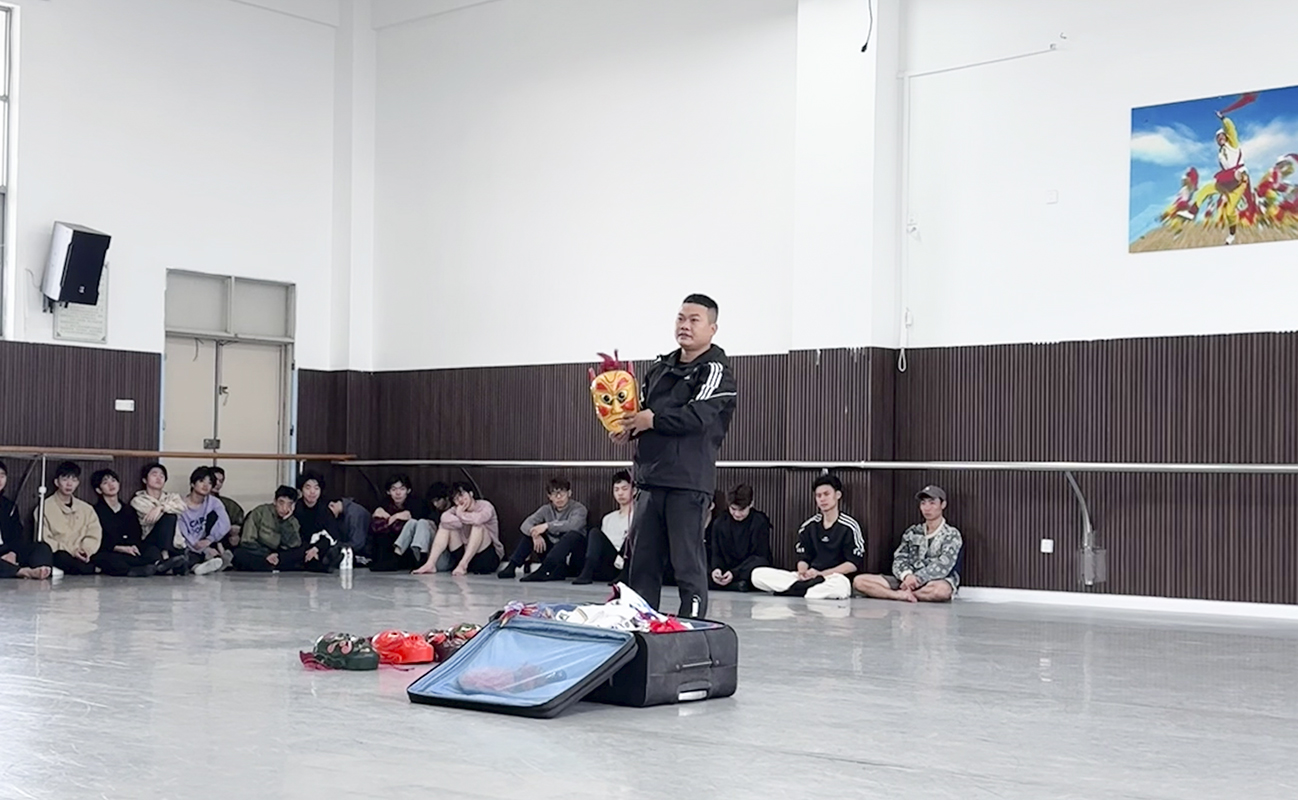 活动过程中,陈林善以其深厚的学识与丰富的经验,从傩舞的面具雕琢、服装设计到音乐配器等,全面深入地揭示了湛江傩舞的独特魅力。他不仅口传心授,更亲自下场示范,指导现场师生学习傩舞动作,每一个动作都流露出傩舞的古朴韵味与神秘气质。随后的交流环节中,同学们更是积极踊跃,纷纷就傩舞的历史渊源、文化内涵以及如何在现代社会中进行有效传承等问题展开了热烈而深入的讨论。