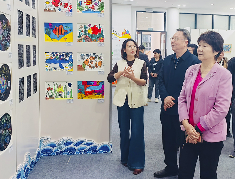 参观过程中,陈娟主任与学校美育浸润项目负责人杜沄老师进行了深入交流,详细询问了中小学美育浸润计划的具体实施、大学生艺术公益课的课程设计与师资配置、帮扶学校学生的参与情况与反馈等关键信息。在了解到该项目已持续覆盖湛江市麻章区4所乡镇中小学,累计授课近1000课时后,陈娟主任给予了充分肯定。她指出,展览中遂溪鱼灯、湛江醒狮等本土非遗元素的创新演绎,以及对海洋生态保护、乡村振兴等时代主题的艺术呈现,件件作品都饱含师生匠心,充满活力。更令人感动的是,展览处处体现了海大师生积极帮扶周边农村中小学开展美育教学的生动实践与责任担当。作为关工委成员,她观展后深受触动,建议未来应进一步加强与学校的协作联动,共同深化校地美育帮扶机制,让艺术之美更广泛、更深入地浸润乡村青少年的心灵,引导他们在美的熏陶中坚定文化自信、传承优秀文化、陶冶高尚情操。