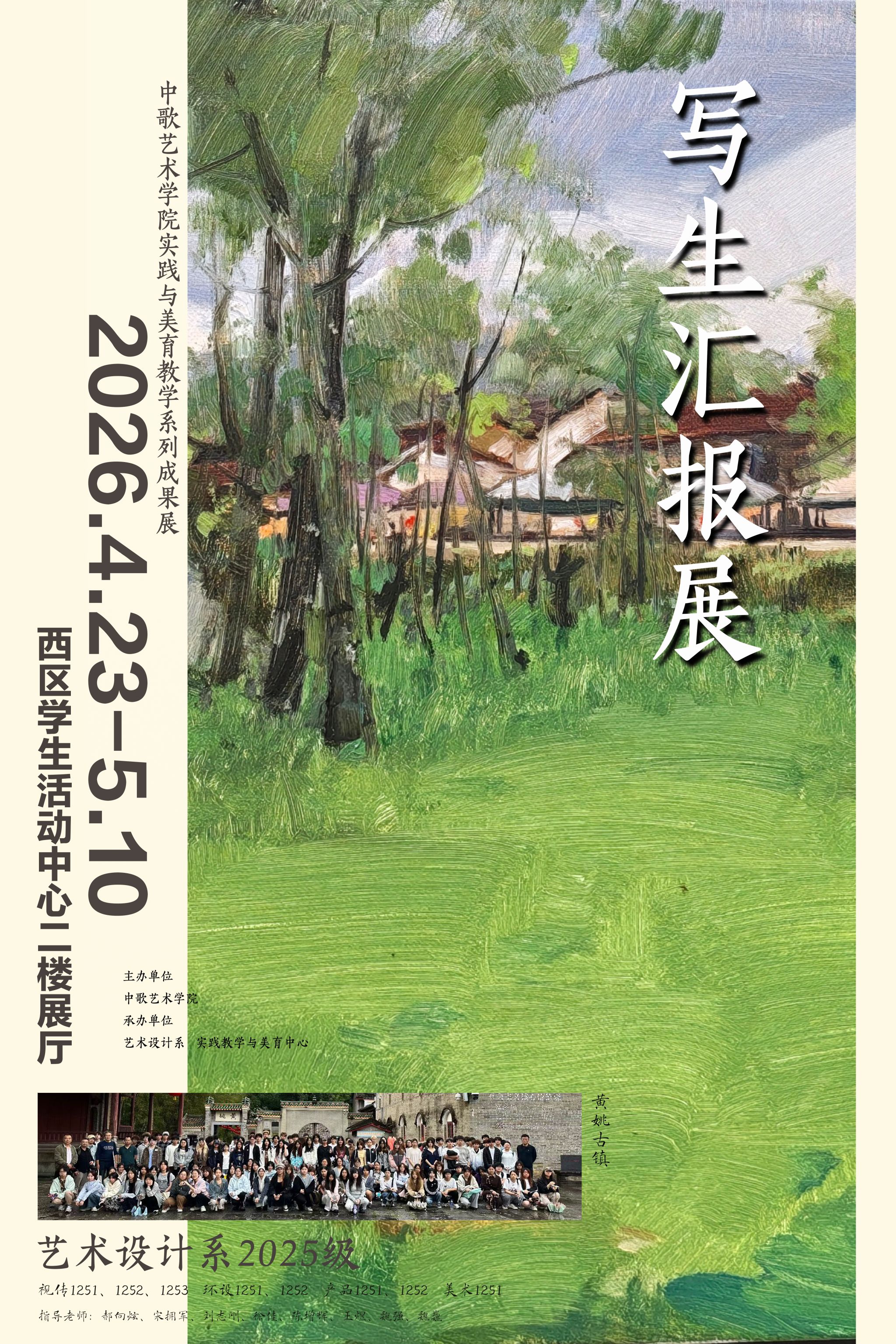 “实践与美育教学系列成果展”喜迎盛事。艺术设计系2025级写生汇报展在湖光校区西区学生活动中心隆重开幕,本次展览以“黄姚古镇写生”为核心主题,集中展示了师生400余幅优秀写生作品,展期共计15天。